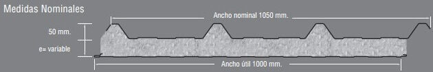 Panel aislado de 4 montes constituido por dos placas de acero y núcleo aislante de lana de roca de alta densidad. Alta resistencia al fuego.
